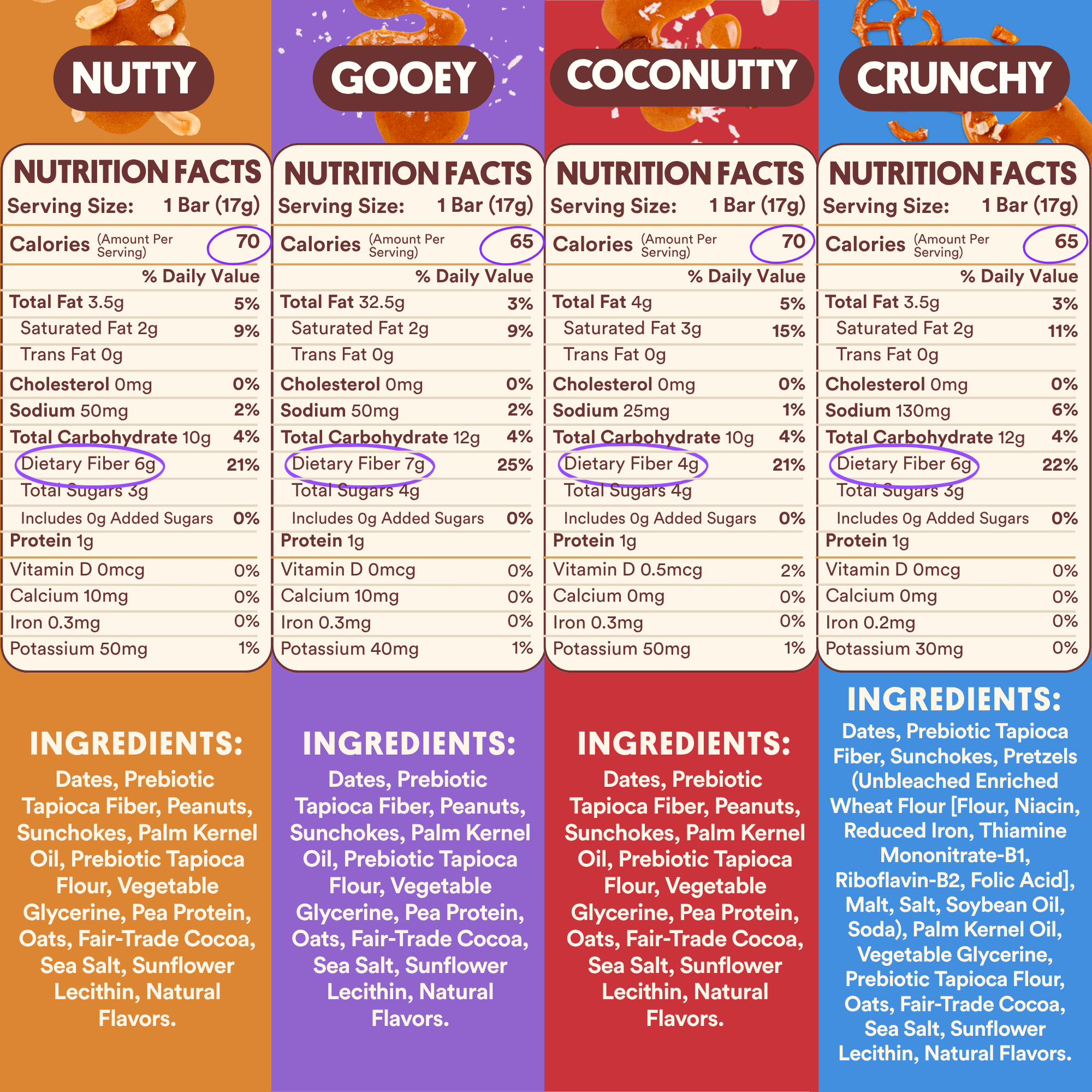 In this variety pack, you will receive The Lil' Nutty Ones, The Lil' Gooey Ones, The Lil' Crunchy Ones, and The Lil' Coconutty Ones.